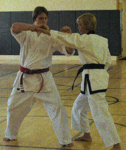 | These students are demonstrating some basic self-defense applications from traditional hyung (forms). This knowledge is a regular feature of training at this school. | |||||||||||||||||||||